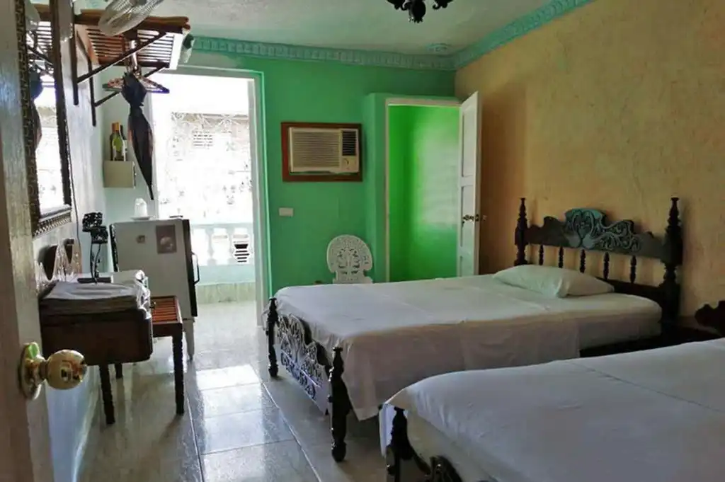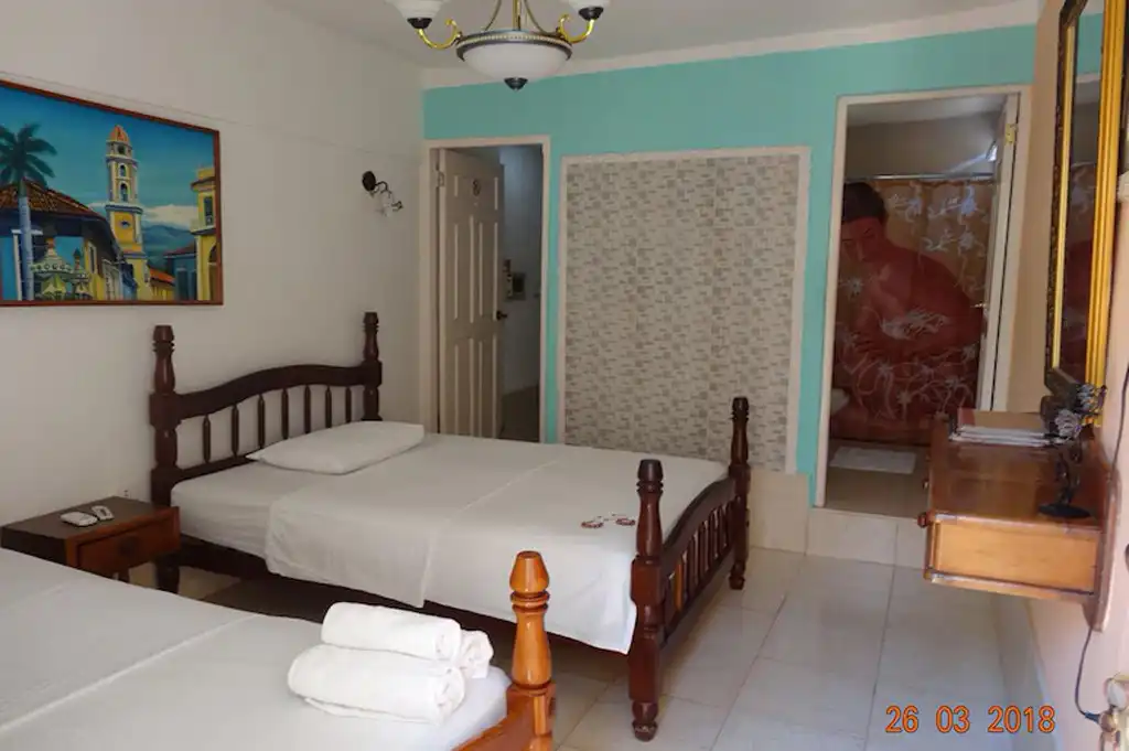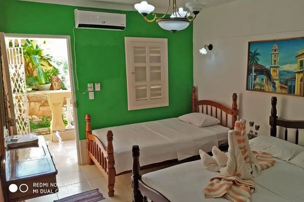 Se alquilan dos habitaciones amplias y espaciosas, cada una con dos camas dobles, caja de seguridad, ventilador, aire acondicionado, baño privado con agua fría y caliente las 24 horas, refrigerador o refrigerador bien surtido para todos los gustos, uno tiene un balcón con vista a la calle y el otro acceso general a La terraza donde se realizan diversos servicios con barbacoa, vistas lindas y diferentes, salida del sol y puesta de sol, área montañosa de Topes de Collantes, centro histórico de la ciudad, playa y hotel Ancon, el alcance del cliente es como estar en familia en su propia casa y luego salir con un Deseo volver, como hacen muchas personas