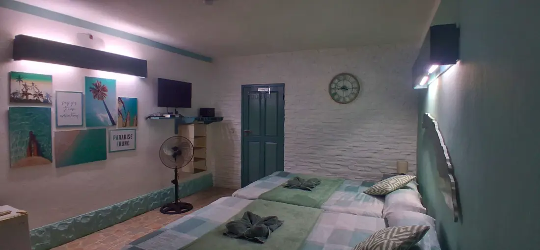 Habitación 2 camas King size, baño con jacuzzy, baño adicional con ducha de hidromasaje, mini bar, Split + lámpara recargable, TV, agua fría y caliente.