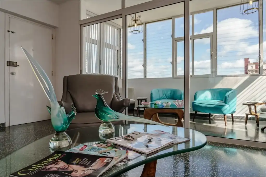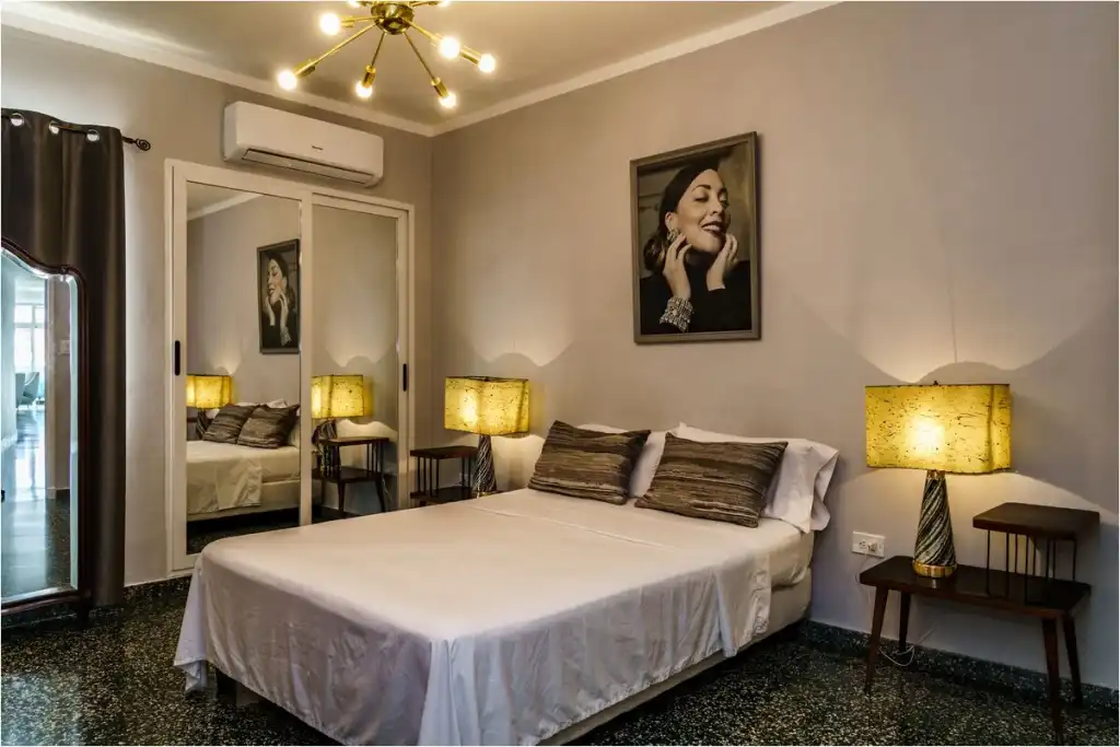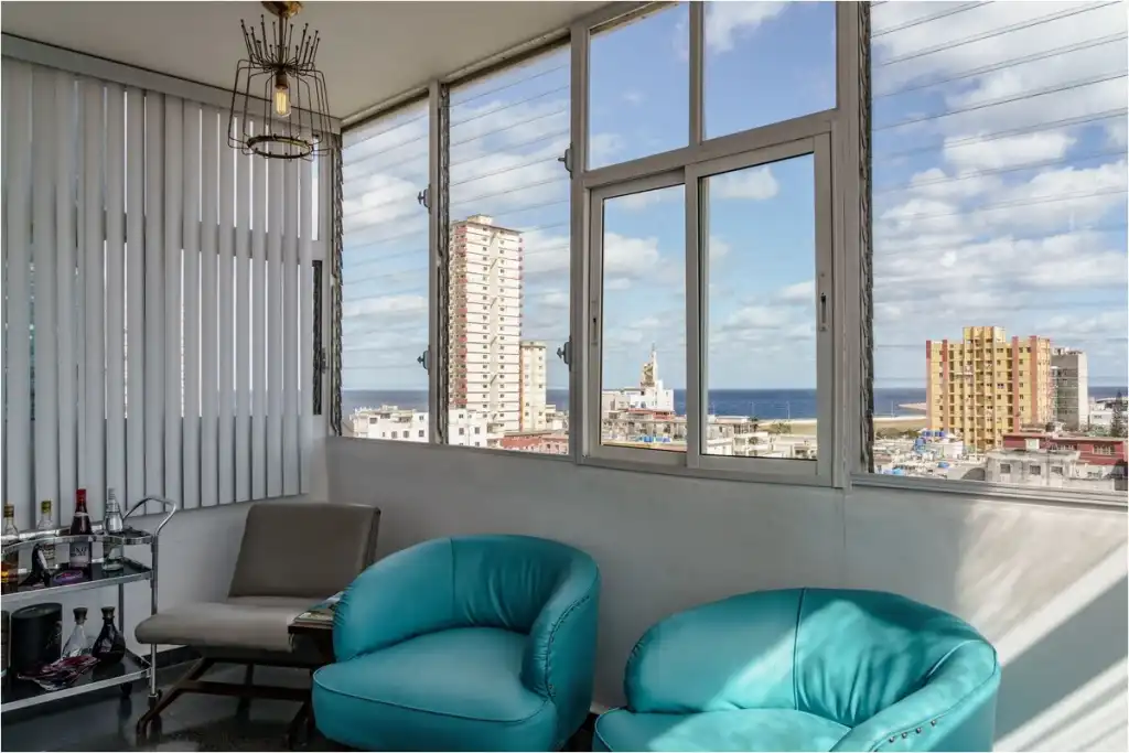 La estancia se comparte con los dueños del apartamento… una pareja de jóvenes cantantes muy populares en el país. Los huéspedes pueden hacer uso del salón-comedor y la terraza. No está permitido el uso de la cocina pero contamos con servicio de desayuno por 5cuc por persona por día. Se puede fumar en la terraza. Leonida s Mid Century